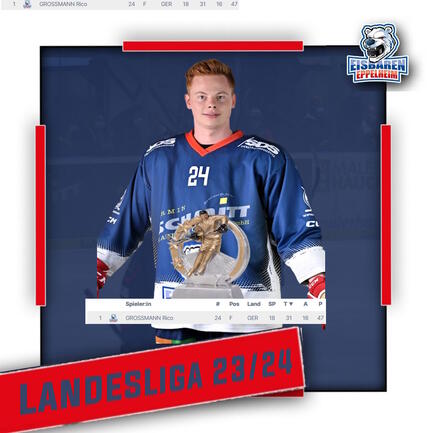 Mit Abschluss der Saison steht nun auch fest, dass die Eisbären Eppelheim in dieser Saison den Top-Torschützen der Landesliga stellen. Mit 31 Treffern aus 18 Partien verwies unsere Nummer 24, Rico Großmann, die Konkurrenten Pascal Pinsack (SERC, 26 Tore) und Evan Carroll (CfR PF, 25) auf die Plätze. Wir gratulieren Rico recht herzlich zu diesem Erfolg, mit dem er es dank weiterer 16 Tor-Vorlagen mit 47 Scorerpunkten auf Platz 4 der Topscorer geschafft hat.